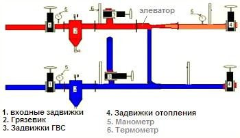 Le système de chauffage central des locaux d'habitation prévoit une chaufferie commune, à partir de laquelle le liquide de refroidissement chauffé est distribué par des tuyaux aux maisons jusqu'aux consommateurs. Le rôle du régulateur de température du liquide de refroidissement est assuré par l'unité d'ascenseur du système de chauffage.