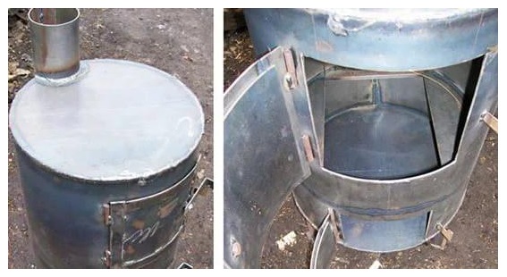 - Au stade final, un trou est percé dans le corps du grand baril, ce qui est nécessaire pour le tuyau d'évacuation des gaz et un volet pratique avec une petite poignée est intégré dans le tuyau.