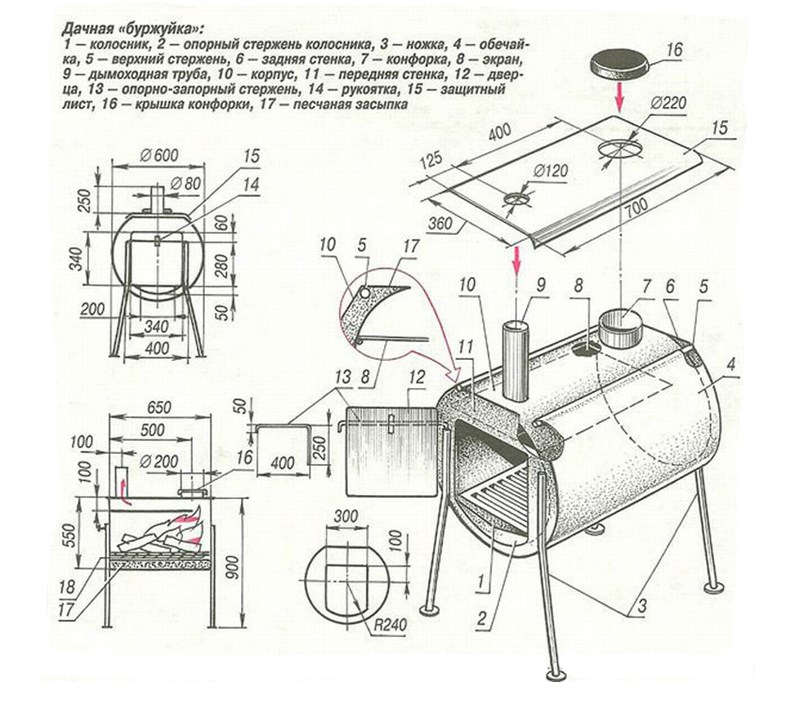 Fondamentalement, les poêles ventru sont fabriqués à partir de fûts métalliques ou de bouteilles de gaz, en utilisant des matériaux et des équipements supplémentaires à cette fin. Pour faire un appareil à part entière, il est conseillé de préparer d'abord un dessin d'un futur poêle en brique ou en fonte et de faire le plein de tous les matériaux nécessaires. Sur le dessin, les pièces principales et auxiliaires, par exemple un échangeur de chaleur, sont indiquées à l'avance. Les fours d'un baril et d'un cylindre sont assemblés selon un schéma similaire, en respectant toutes les étapes.