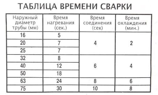 Un point important lors de l'auto-soudage du chauffage de l'eau à partir de polypropylène est le temps de chauffage des pièces. Cela dépend du diamètre du tuyau et de l'épaisseur de la paroi. Avec une fusion insuffisante du matériau, le processus de diffusion sera faible, ce qui conduira éventuellement à un délaminage du joint. Si le tuyau de dérivation et le raccord sont surchauffés, une partie du matériau s'évaporera et, par conséquent, une forte diminution des dimensions extérieures. Par conséquent, pour l'installation du chauffage en polypropylène, vous devez respecter le temps de chauffage recommandé pour le plastique, en fonction de son diamètre et de l'épaisseur de sa paroi.