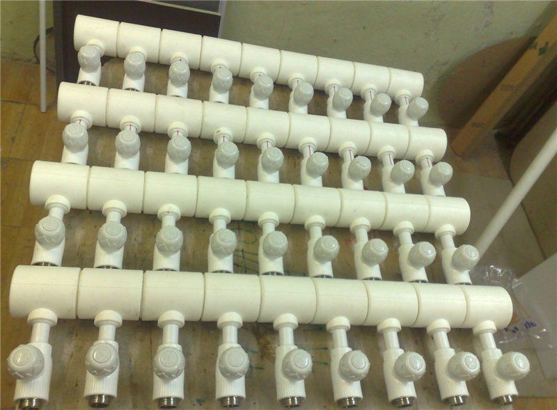 À l'aide d'un fer à souder, un collecteur est formé à partir de tés et de tuyaux en polypropylène. Des robinets à tournant sphérique sont montés sur chaque sortie. L'inconvénient de l'installation d'une telle conception pour le chauffage en polypropylène est la différence entre les dimensions de la section transversale des tuyaux - la règle des 3 diamètres n'est pas respectée.