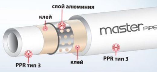 Tous les tuyaux en polypropylène pour le chauffage doivent avoir une couche de renforcement. Il est fabriqué à partir de papier d'aluminium ou de fibre de verre. Ces derniers se caractérisent par une plus grande fiabilité, mais aussi un prix plus élevé. Si la technologie d'application du papier d'aluminium est violée, il est possible de séparer la couche externe ou interne de sa surface.