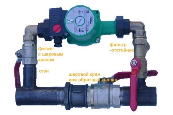 En général, la disposition d'un système de chauffage ouvert avec une pompe de circulation n'est pas différente de ce qui précède. Il est important de choisir le bon emplacement pour la pompe. Il est monté sur le tuyau de retour devant son entrée à la chaudière de chauffage. La distance optimale doit être de 1,5 m.