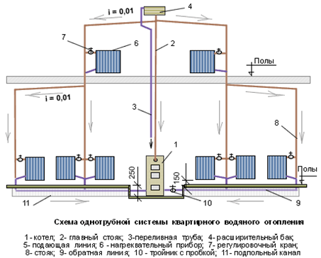 - Tuyau simple... Dans celui-ci, les appareils sont connectés au système en série. Avantages - installation simple, un minimum de consommables. Inconvénients - refroidissement rapide du liquide de refroidissement;