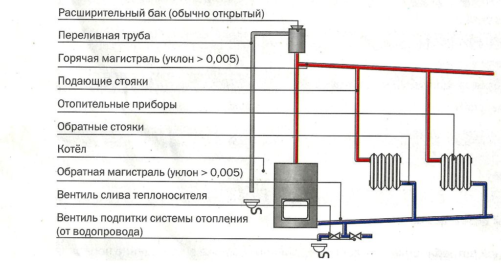 - Dilatation thermique de l'eau chaude... Cela nécessite une colonne montante d'accélération. Selon ce schéma, un système de chauffage ouvert à circulation naturelle est conçu;