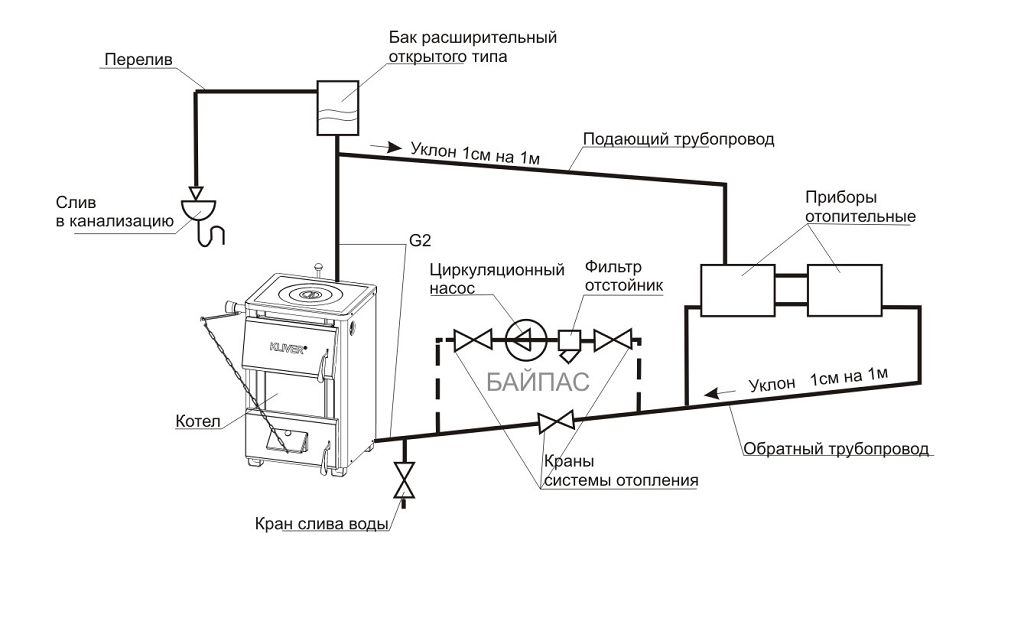 Pour augmenter l'efficacité du travail dans un circuit de chauffage ouvert à circulation naturelle, le diamètre du tuyau de surpression doit être inférieur d'une taille à la section transversale de la conduite principale.