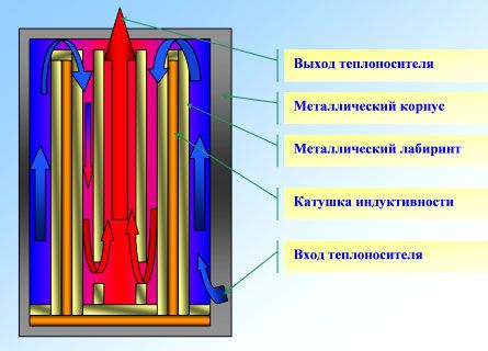 Pour chauffer l'eau, une bobine électromagnétique est prévue dans la structure. Un noyau est situé à l'intérieur. Lorsqu'il est connecté au secteur, un champ électromagnétique est créé, ce qui provoque un échauffement du noyau. À son tour, il est lavé par le flux de liquide de refroidissement. Ainsi, l'eau est chauffée à l'aide d'une chaudière à induction pour le chauffage.