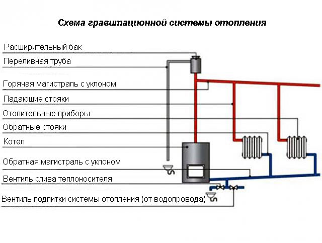 Le système d'écoulement le plus simple est rendu gravitationnel. Pour son organisation, des chaudières de chauffage à circulation, un vase d'expansion de type ouvert ou à membrane sont nécessaires. La conduite de transport du liquide de refroidissement est une canalisation qui alimente en eau les radiateurs et la chaudière pour le réchauffage.
