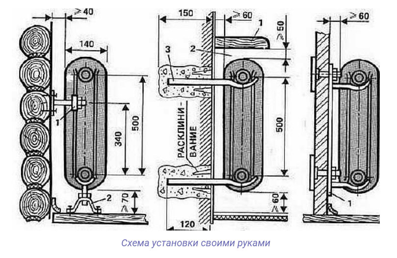Lors de l'installation de batteries de tout type, les normes du SNiP numéroté 41-01-2003 de la section sur le chauffage, la ventilation et la climatisation doivent être respectées. La hauteur du radiateur au sol ne peut pas être inférieure à 10 cm, au mur - 3 à 5 cm, à chaque rebord de fenêtre - à partir de 5 cm.