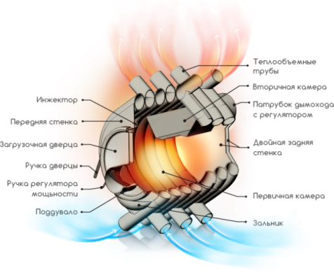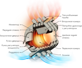 Le carburant est chargé à travers un volet, qui est hermétiquement fermé par un verrou excentrique. Il y a un régulateur de soufflerie sur la porte - l'utilisateur contrôle indépendamment la vitesse de combustion. Le passage au mode postcombustion s'effectue en ajustant le registre sur la cheminée. Un cendrier est utilisé pour se protéger contre la perte de charbon de bois.