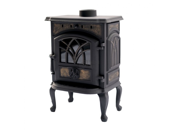 Poêle cheminée en fonte avec volet résistant à la chaleur. La butée est en fonte et sert en même temps de séparateur. Il y a des registres supérieurs et inférieurs pour le contrôle de la température. Le foyer est double, l'appareil est équipé de systèmes de postcombustion et de vitres propres.