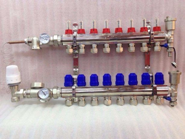Auparavant, les collecteurs étaient assemblés à partir d'une variété de tés avec des vannes d'arrêt. Désormais les technologies permettent de fabriquer un produit selon les besoins du client. Le groupe collecteur fini se compose de deux matrices avec un diamètre d'alésage de 1 pouce. Ce diamètre est utilisé dans la plupart des cas. Les sorties pour appareils de chauffage - 0,5 ", si nécessaire, les alignements avec de petits diamètres sont équipés d'adaptateurs ¾".