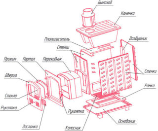 - Ouragan. L'unité de four est équipée d'un grillage forgé haut, d'un caisson en fonte, d'une porte pliante, d'une entretoise de montage et d'un tuyau de départ de 50 cm de long en fonte. Le grillage peut être facilement remplacé par un revêtement en pierre sans démonter le four. Le poêle a une forme trapézoïdale et est utilisé pour une combustion à long terme. Le foyer est réglable.