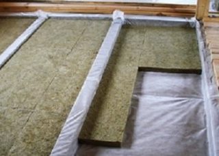 - Isolation du sol - lors du choix des dalles, l'indicateur de résistance à la compression est pris en compte. Le taux recommandé est de 10 %. Lors de la pose sur des bûches, l'isolation n'est pas chargée, vous pouvez choisir l'option de résistance inférieure. Pour protéger la laine de basalte de l'humidité, une feuille d'imperméabilisation est posée dessus avec un chevauchement de 10-15 cm.Des dalles rigides sont prises sous la chape. Une imperméabilisation est posée sous eux et un treillis de renforcement est placé sur le dessus.