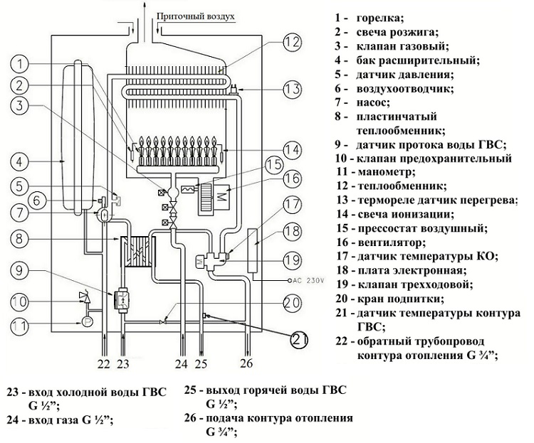 L'équipement de série chauffe une superficie de 100 à 400 m2, dispose de 2 échangeurs de chaleur. Le premier est en cuivre, le second se caractérise par une vitesse de traitement élevée et passe par 14 l/min. Le brûleur électrique turbocompressé ajuste en douceur le mélange air-carburant en fonction du volume de carburant.