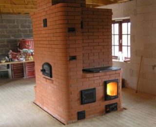 - Russe - a un design complexe et une grande taille. Il dispose d'un foyer de type à deux zones, où une partie (boulangerie) est utilisée pour la cuisson, l'autre (foyer) est utilisée pour brûler du bois de chauffage.