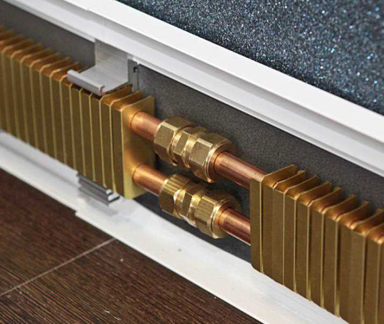 Le système de chauffage par plinthe est un équipement compact qui est installé au sol le long des murs, non recouvert par des meubles d'armoire. Le corps rectangulaire est en aluminium. Dans les plans verticaux et horizontaux, les produits ont des fentes conçues pour l'admission, le chauffage et la sortie d'air.