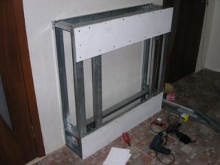- Le cadre est gainé de plaques de plâtre. Tout d'abord, la doublure intérieure est fixée, puis les parois extérieures.