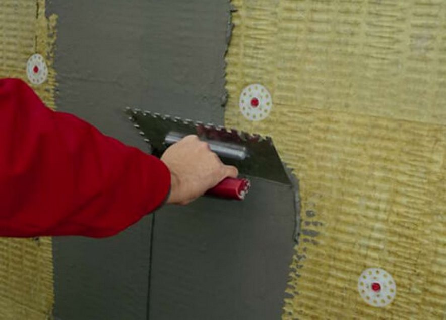 Les panneaux isolants, tels que la mousse de polystyrène, la mousse de polystyrène extrudé, sont fixés avec de la colle. La composition est appliquée au dos du panneau et pressée contre la surface du mur. Les goujons-champignons sont utilisés de la même manière. La colle sèche pendant 24 heures, après quoi le plâtre est appliqué.