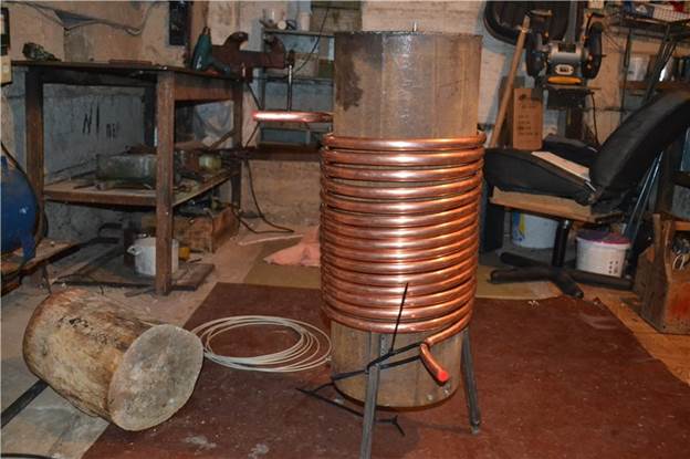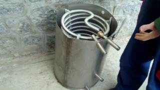 Le serpentin peut être dans l'air ou à l'intérieur d'un réservoir supplémentaire. La deuxième option implique un conteneur scellé situé autour d'une cheminée métallique. Les raccords pour l'alimentation et l'évacuation du liquide chauffé sont soudés au réservoir.