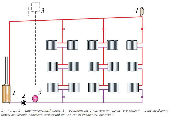 - Consommation minimale de matière... C'est un avantage non négligeable car cela se reflète dans le budget de chauffage. C'est le petit nombre de canalisations qui est le facteur déterminant dans le choix de ce schéma ;
