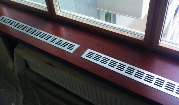 Étant donné que la grille doit fournir une montée accélérée d'air chaud des appareils de chauffage aux fenêtres à travers les rebords de fenêtre, son emplacement est choisi aussi près que possible des fenêtres. Dans les appuis de fenêtre larges, l'installation des grilles s'effectue strictement au-dessus des batteries, tandis que les ouvertures des grilles doivent correspondre aux dimensions de la partie supérieure des radiateurs. Les sections des grilles peuvent être de formes différentes, mais la somme totale de leurs surfaces doit être comprise entre 0,42 et 0,60 w / s. Ces indicateurs sont suffisants pour une ventilation optimale.