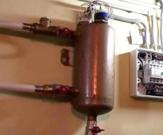 Au bas de la chaudière, à partir d'un morceau de tuyau en acier fabriqué à la main, un élément chauffant est installé selon la méthode des brides. Au sommet, il y aura un vase d'expansion avec une ouverture pour le remplissage d'eau. Les conduites d'eau sont raccordées au retour et à l'alimentation.
