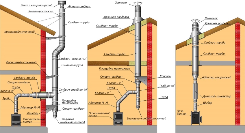 Lorsque des tuyaux sandwich sont retirés à travers la toiture, son étanchéité est violée, ce qui oblige à prendre des mesures de protection supplémentaires. À ces fins, des dispositifs et des produits d'étanchéité spéciaux sont utilisés. Ces pièces ont des dimensions normalisées, des angles d'inclinaison fixes et sont sélectionnées en tenant compte des paramètres d'un toit particulier. Les parois des tuyaux sandwich doivent être situées à une distance d'au moins 250-370 mm des matériaux inflammables. Pour protéger contre les fuites d'eau, un tablier spécial est installé autour de la sortie, dont les bords sont enroulés sous le couvercle.