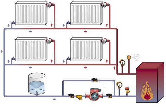 Si le système de chauffage "Leningradka" à circulation forcée est organisé, une autre pompe sera nécessaire. Pour améliorer les possibilités, des vannes à bille (2 pièces par batterie) et des by-pass avec une vanne à pointeau sont utilisés.