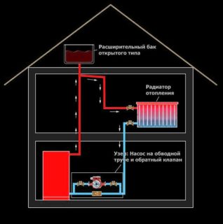 Le réseau de radiateurs assure le mouvement forcé de l'eau. La poussée dans ce cas est créée par la pompe. Il augmente également la pression à partir de 1 bar pour un caloporteur froid. Le réservoir est du type à membrane, situé au fond. Une vanne d'arrêt est utilisée pour le connecter à la ligne. Les dispositifs de sécurité (évent, manomètre, vanne de vidange) sont obligatoires.