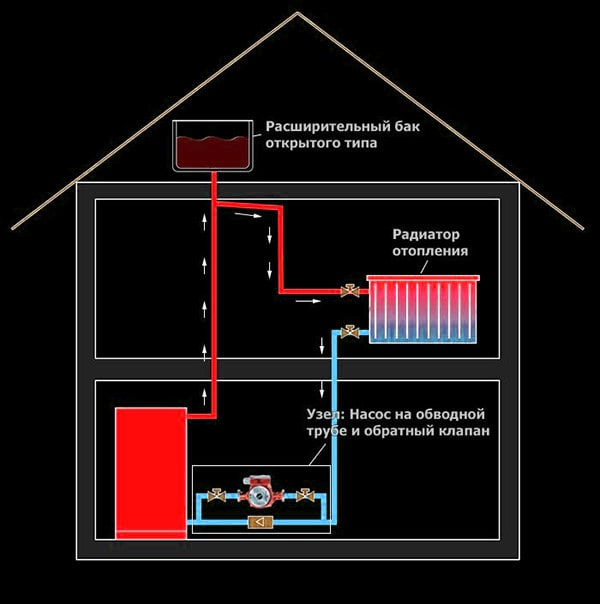 Le liquide de refroidissement se déplace de manière gravitationnelle, par conséquent, l'installation d'une pompe de circulation est nécessaire. Il est placé sur le by-pass, réduit la différence de température entre le retour et l'alimentation, augmente la vitesse de circulation de l'eau et la qualité du transfert de chaleur. Sans électricité, la ligne fonctionnera par gravité.