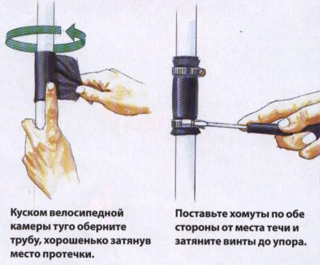 - Tube de vélo en caoutchouc ou similaire. La largeur de la pièce doit dépasser les dimensions de la fuite d'au moins 30 à 40% et la longueur doit être telle que le joint en caoutchouc puisse envelopper le tuyau plusieurs fois;