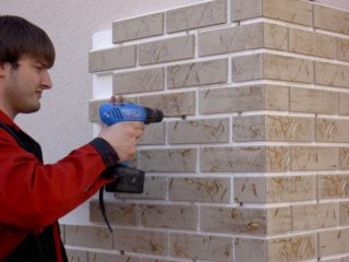Le premier panneau est installé dans le coin inférieur gauche. Les contours sont faits pour les trous dans le mur. Après cela, le revêtement est fixé avec des vis autotaraudeuses.