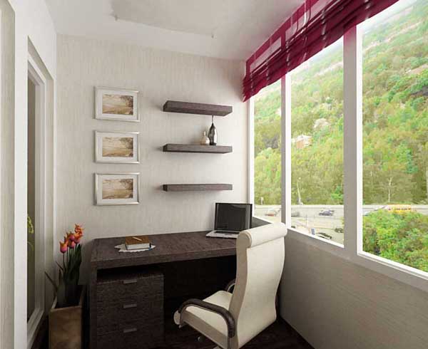 - Le but d'utiliser le balcon. La zone de stockage est isolée autour du périmètre, un lieu de repos - du côté de la pièce, une loggia-bureau, une bibliothèque ou une salle de sport - à travers des fenêtres sur toute la surface.