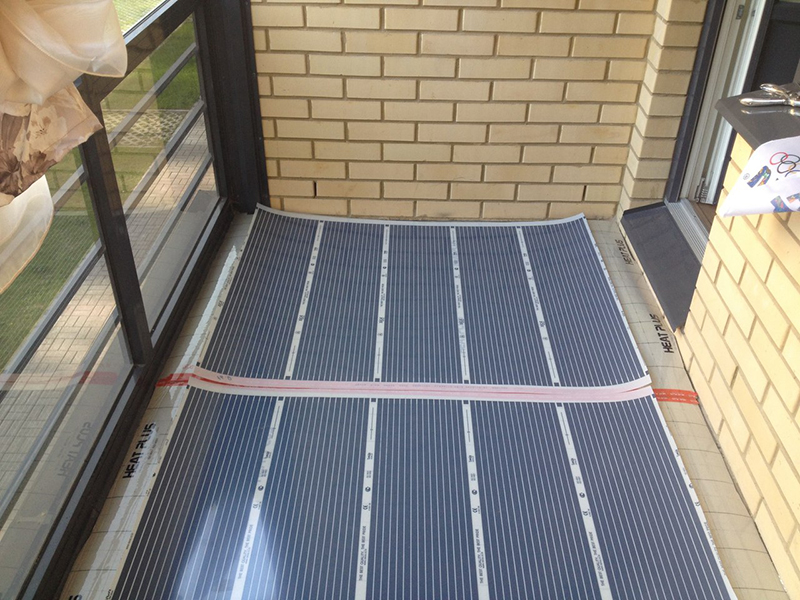 - Installation de mousse de polyéthylène sur la couche de base. Les feuilles sont empilées bout à bout sur de la colle polyuréthane et collées le long du joint avec du ruban métallique.