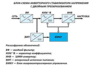 Les appareils les plus efficaces et les plus fiables sont les onduleurs construits selon le schéma de double conversion. La tension d'entrée qu'ils contiennent est d'abord rendue constante, puis des impulsions haute fréquence sont formées à partir d'un potentiel stable. A l'étape suivante, ils sont commutés par de puissantes diodes, formant une tension de forme similaire à l'entrée, mais indépendante du réseau. Un appareil électronique fonctionne comme ceci :