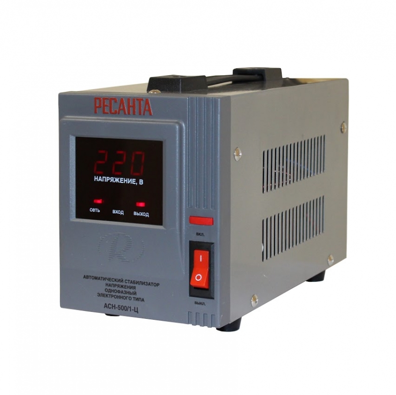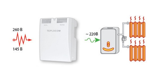 Les modèles d'évaluation des stabilisateurs de tension pour la chaudière sont représentés par des unités de relais et d'onduleur. Les analogues électromécaniques ne sont presque jamais utilisés. Le premier type est « Resanta ACH-500/1-Ts » avec une puissance déclarée de 500 watts. La tension d'entrée peut varier dans la plage de 160 à 240 volts et le temps de réponse est de 7 ms. Le nombre d'étages de régulation de tension est de 4, et une prise (norme européenne) est prévue en sortie.