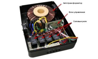 Les stabilisateurs à relais sont des dispositifs qui fonctionnent sur le principe de la conversion par étapes. Le circuit est basé sur un autotransformateur dont les enroulements de sortie sont commutés de manière à compenser les écarts d'entrée. Le changement du nombre de tours dans l'enroulement secondaire se produit automatiquement en raison du fonctionnement des relais électromagnétiques. Un bloc spécial contrôle leur commutation. Avec son aide, les paramètres de la tension secteur sont surveillés et, si nécessaire, l'étage de stabilisation requis est activé.