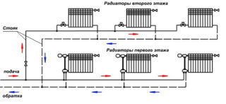 Les schémas permettent une connexion supérieure ou inférieure. Dans le second cas, le pipeline peut être caché sous le sol. Il est pris en compte que cela réduira légèrement le transfert de chaleur des radiateurs, car une partie de l'énergie est dépensée pour chauffer la chape.