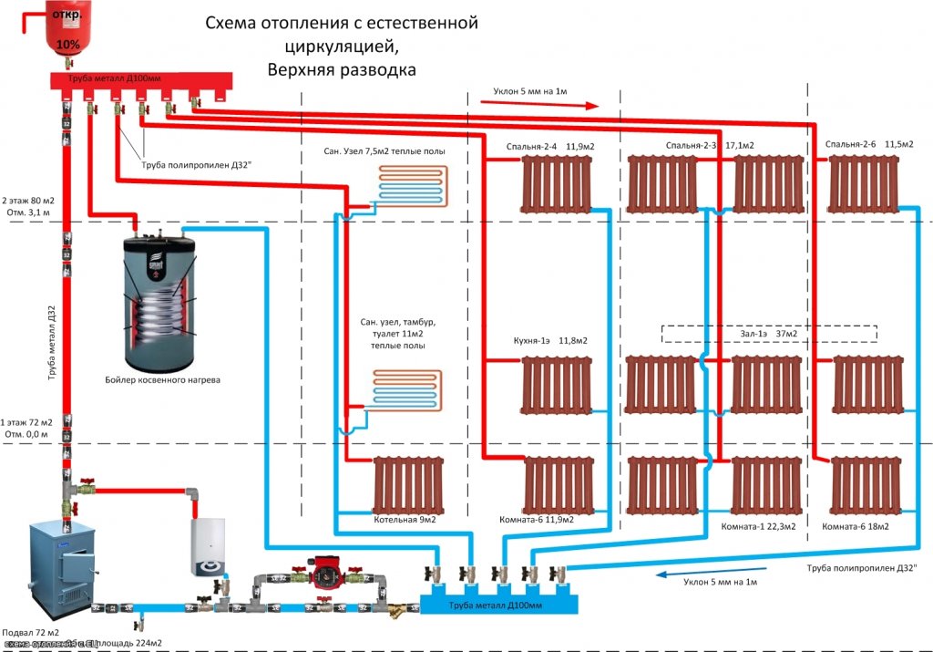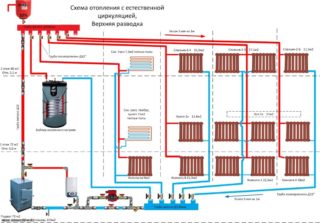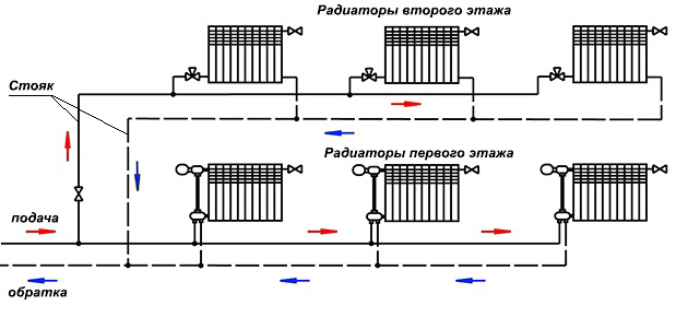 Lors de l'aménagement de grands bâtiments, c'est le schéma à deux tuyaux qui est utilisé. Les radiateurs sont connectés en parallèle. Selon l'emplacement des tuyaux d'alimentation, on distingue les schémas avec câblage supérieur et inférieur.