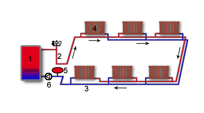 Le schéma sans issue a un autre nom - avec le mouvement venant en sens inverse du liquide de refroidissement. Le schéma est divisé en sections. Le liquide de refroidissement chauffé s'écoule par le tuyau de la chaudière à la batterie la plus éloignée, qui retourne à la chaudière par le tuyau de retour. La popularité est donnée par la simplicité de compréhension, mais cela nécessite un calcul et une configuration compétents du système. Plus la chaudière est éloignée, plus les tuyaux doivent être fins. Après le démarrage, chaque radiateur est réglé avec des vannes d'arrêt. Un réglage incorrect peut entraîner cela. Que tout le liquide de refroidissement passera par un radiateur, le reste restera froid.