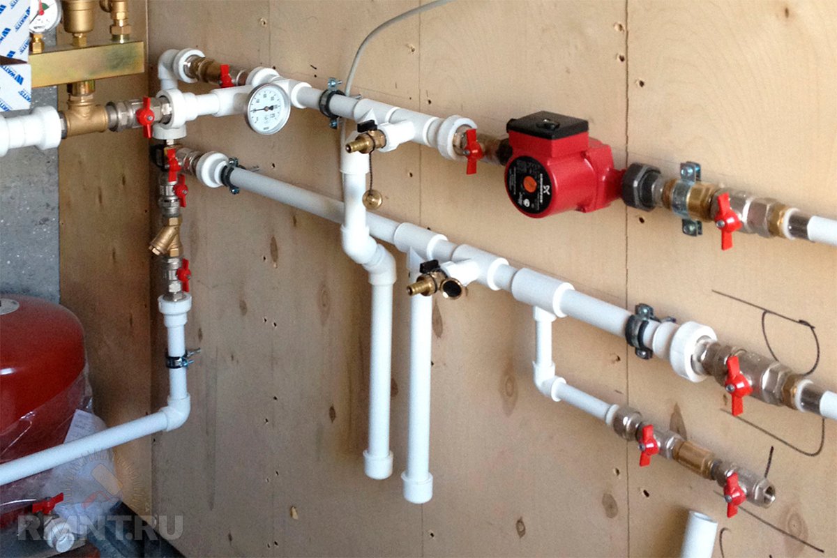 Au retour, une pompe est installée, dont la puissance devrait suffire à neutraliser la résistance de l'hydraulique. Le système de tuyauterie de la chaudière comprend des vannes d'arrêt qui sont montées à côté de celle-ci sur les deux tuyaux et à proximité du vase d'expansion. Ils sont également fixés sur les côtés de la pompe et sur le tuyau d'alimentation situé à proximité.