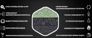 Il a une couleur noire, la matière se caractérise par un indice d'acidité neutre. Le coefficient de conductivité thermique est à -20 degrés - 0,034 et à +20 - 0,038.