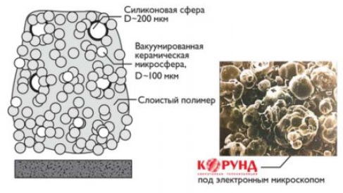 L'isolant thermique liquide Korund est composé d'un mélange de charges céramiques et d'une solution à base d'eau et d'acrylique. Les particules de céramique jouent le rôle d'isolant, et la solution permet de répartir les éléments isolants sur toute la surface en une couche uniforme. Une telle composition peut être appliquée rapidement et facilement sur n'importe quelle zone en une couche uniforme. La composition contient divers additifs de connexion qui améliorent les caractéristiques de l'isolant thermique. Les plus populaires sont le caoutchouc et le silicone.