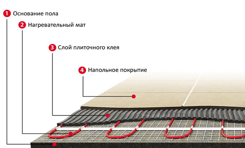 - L'installation des sections de câbles est réalisée sous la chape de stratifié ou de parquet, de tapis - sous les carreaux ou la pierre naturelle.