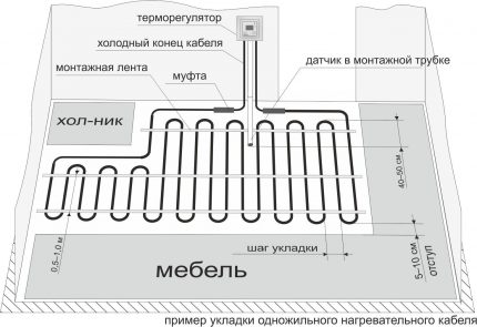 Les câbles chauffants ont une épaisseur de 8 à 15 mm et sont constitués de 1 ou 2 conducteurs. Selon le diamètre, le fil a un rayon de braquage minimum qui ne peut pas être réduit. L'installation est réalisée avec un serpent avec un retrait des murs de 10-15 cm.Après la fixation, la structure est coulée avec une chape en ciment et carrelée. Un tel chauffage au sol électrique pour carrelage est principalement utilisé dans les constructions neuves sans finition et lors de grosses réparations, lorsqu'il est nécessaire de niveler la plaque de base.