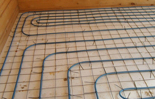 Le circuit d'eau peut être posé entre des vis autotaraudeuses vissées dans le sol ou dans des blocs de mousse avec des canaux sous le tube. Après avoir placé la ligne, ses extrémités sont fixées de manière rigide aux tuyaux collecteurs connectés au mélangeur. Le contrôle des performances est effectué sous pression de service pendant 2-3 heures. Ce n'est qu'alors que la chape peut être coulée. Il est permis d'utiliser les locaux après le durcissement complet du béton.