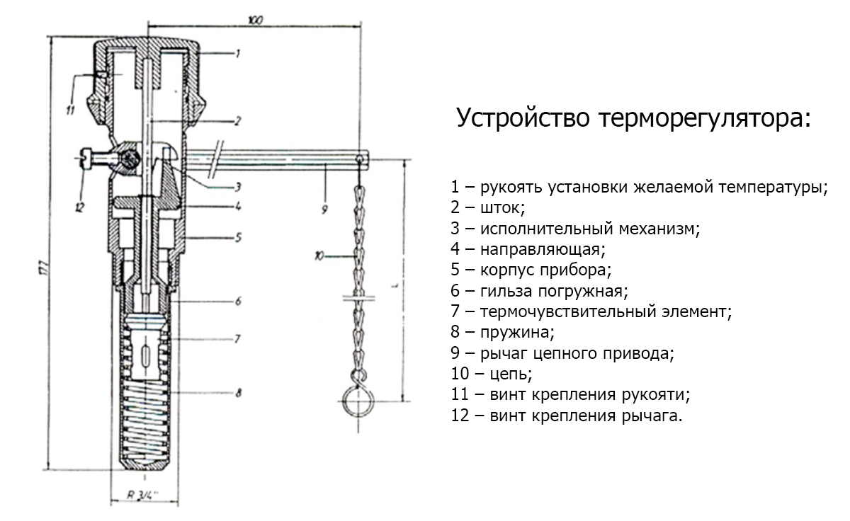 La partie principale est un élément thermique automatique pour assurer une température uniforme. Le maillon est placé dans une boîte cylindrique et coordonne le mouvement de la porte du cendrier au moyen d'une chaîne et d'un levier. Le corps fileté est inséré dans le manchon de la coquille d'eau, qui est en contact avec le vecteur d'énergie.