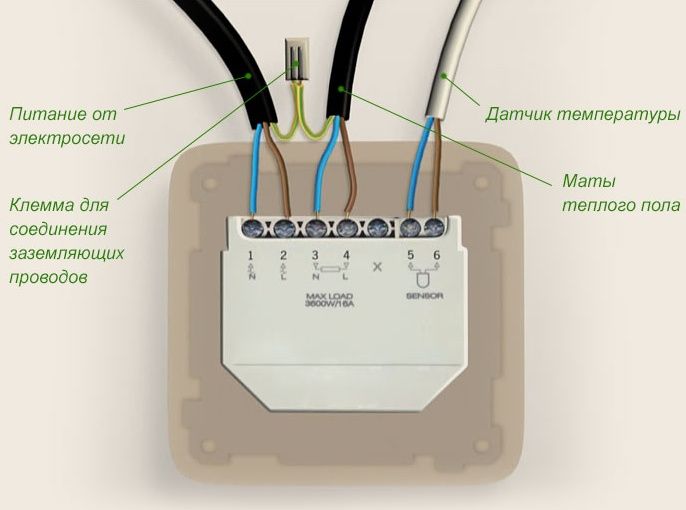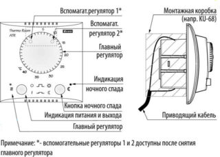 Pour le thermostat encastrable, une niche est découpée dans le mur pour une prise de courant standard (son diamètre est de 68 mm). Ces dimensions sont bien suffisantes pour s'adapter au thermostat lui-même et à tous les groupes de conducteurs connectés aux bornes. Une fois les fils connectés, et le corps du produit fixé avec les vis fournies avec le kit, il reste à le connecter, pour lequel vous devrez utiliser le manuel d'utilisation.