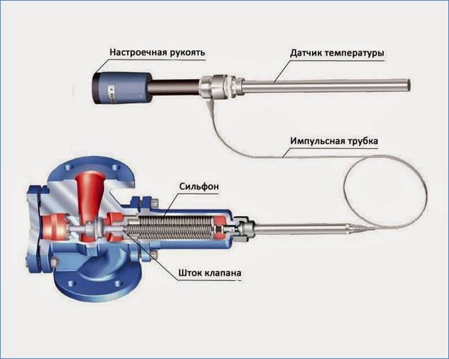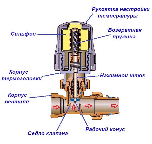 Le principe de fonctionnement de l'appareil repose sur une modification de la section de la vanne. La vanne thermique est reliée à la tête par une tige et un écrou-raccord. La tige se déplace sous l'influence d'une charge de gaz ou d'eau, qui se dilate lors du chauffage. La pression augmente à l'intérieur de la tête, la tige descend progressivement, ferme complètement ou partiellement la lumière de la valve.